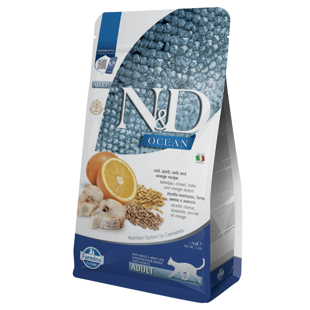 N&D 鱈魚、斯佩爾特小麥、燕麥及橙配方,符合 AAFCO 貓糧營養標準,適合成貓日常維持所需之完整均衡營養。