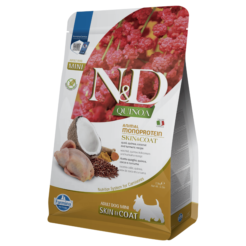 N&D 藜麥 SKIN&COAT 皮膚及毛髮護理配方(鵪鶉、藜麥、椰子及薑黃)Mini 小型犬專用,適合成犬食用,符合 AAFCO 狗糧營養標準中「維持期」之營養需求。