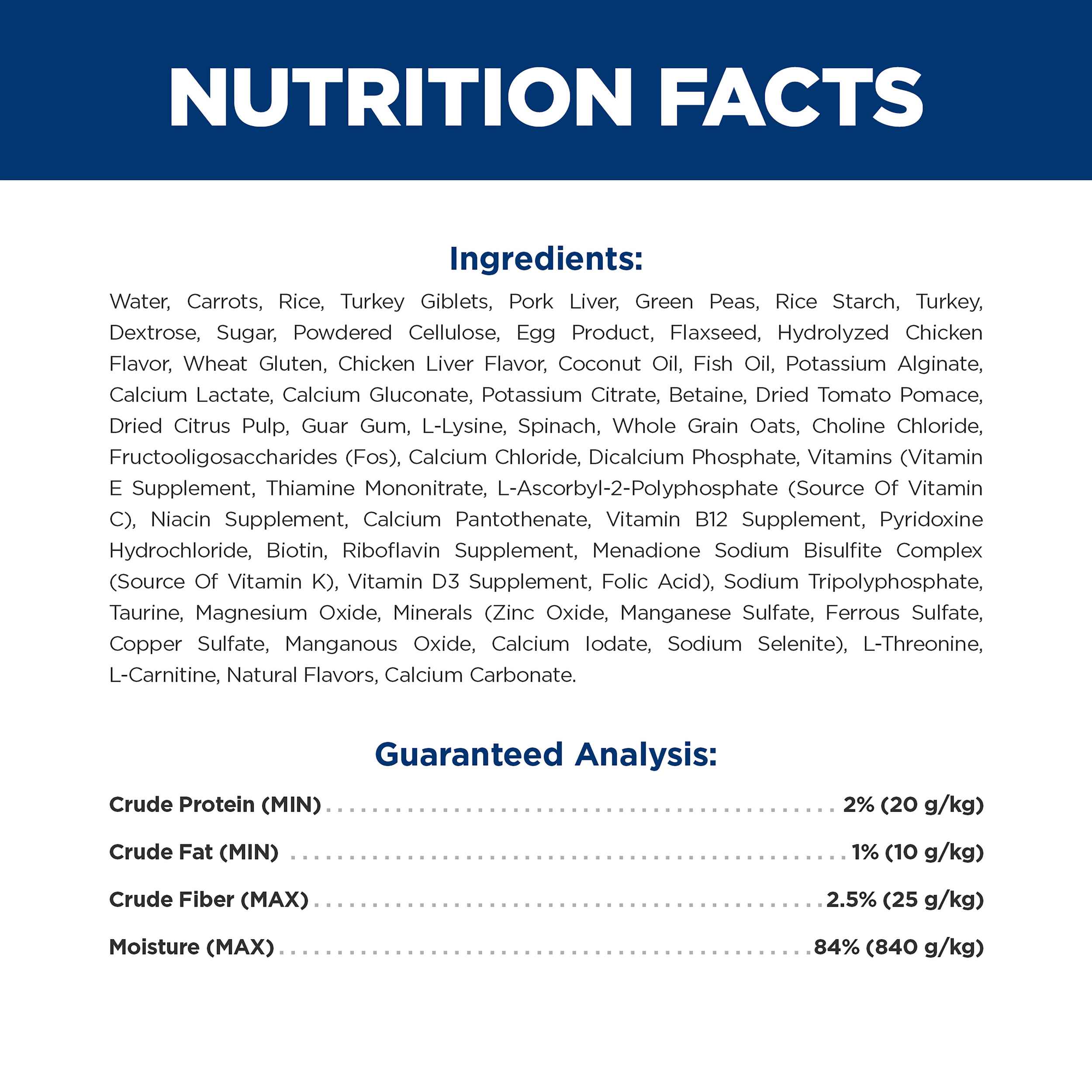 水、胡蘿蔔、大米、火雞內臟、豬肝、青豆、大米澱粉、火雞、葡萄糖、糖、纖維素粉、蛋製品、亞麻籽、水解雞肉香料、小麥麵筋、雞肝香料、椰子油、魚油、海藻酸鉀、乳酸鈣、葡萄糖酸鈣、檸檬酸鉀、甜菜鹼、番茄渣乾、柑橘果肉乾、瓜爾膠、L-賴氨酸、菠菜、全粒燕麥、氯化膽鹼、果寡糖 (FOS)、氯化鈣、磷酸氫鈣、維生素 (維生素 E 補充劑、硫胺素單硝酸鹽、L-抗壞血酸-2-聚磷酸酯 (維生素C來源)、菸鹼酸補充劑、泛酸鈣、維生素 B12 補充劑、鹽酸吡哆醇、生物素、核黃素補充劑、亞硫酸氫鈉甲萘醌複合物(維生素 K 來源)、維生素 D3 補充劑、葉酸)、三聚磷酸鈉、牛磺酸、氧化鎂、礦物質 (氧化鋅、硫酸錳、硫酸亞鐵、硫酸銅、氧化錳、碘酸鈣、亞硒酸鈉)、L-蘇胺酸、L-肉鹼 、天然香料, 碳酸鈣