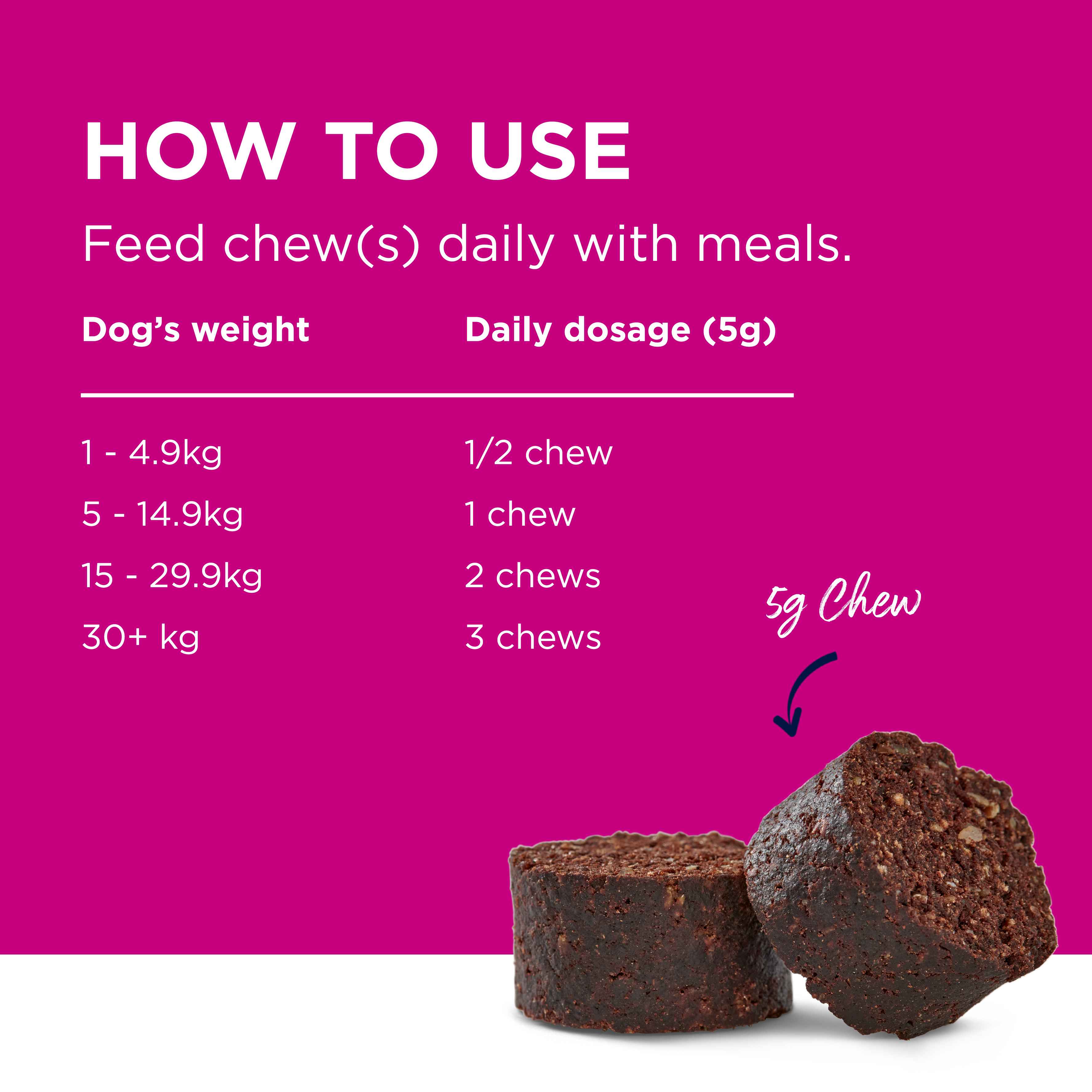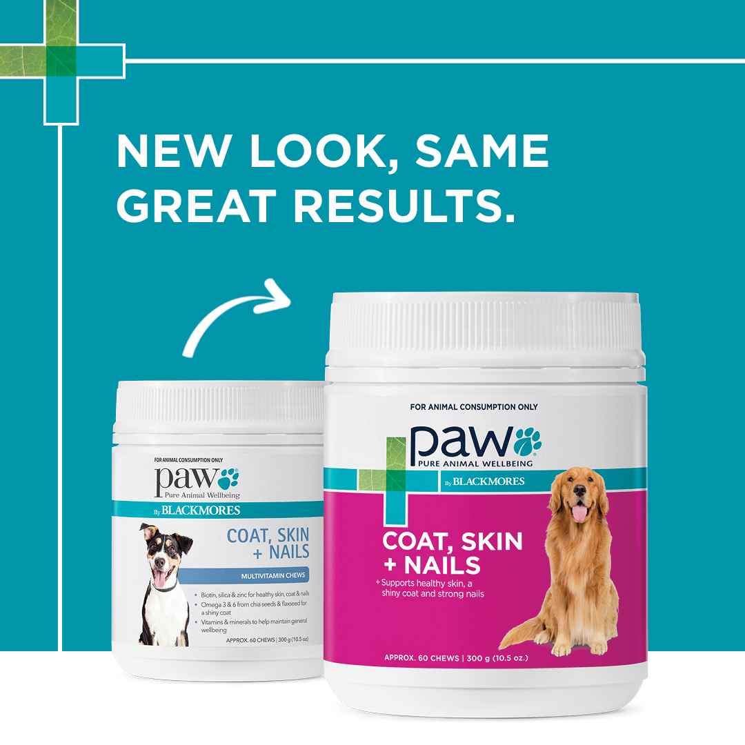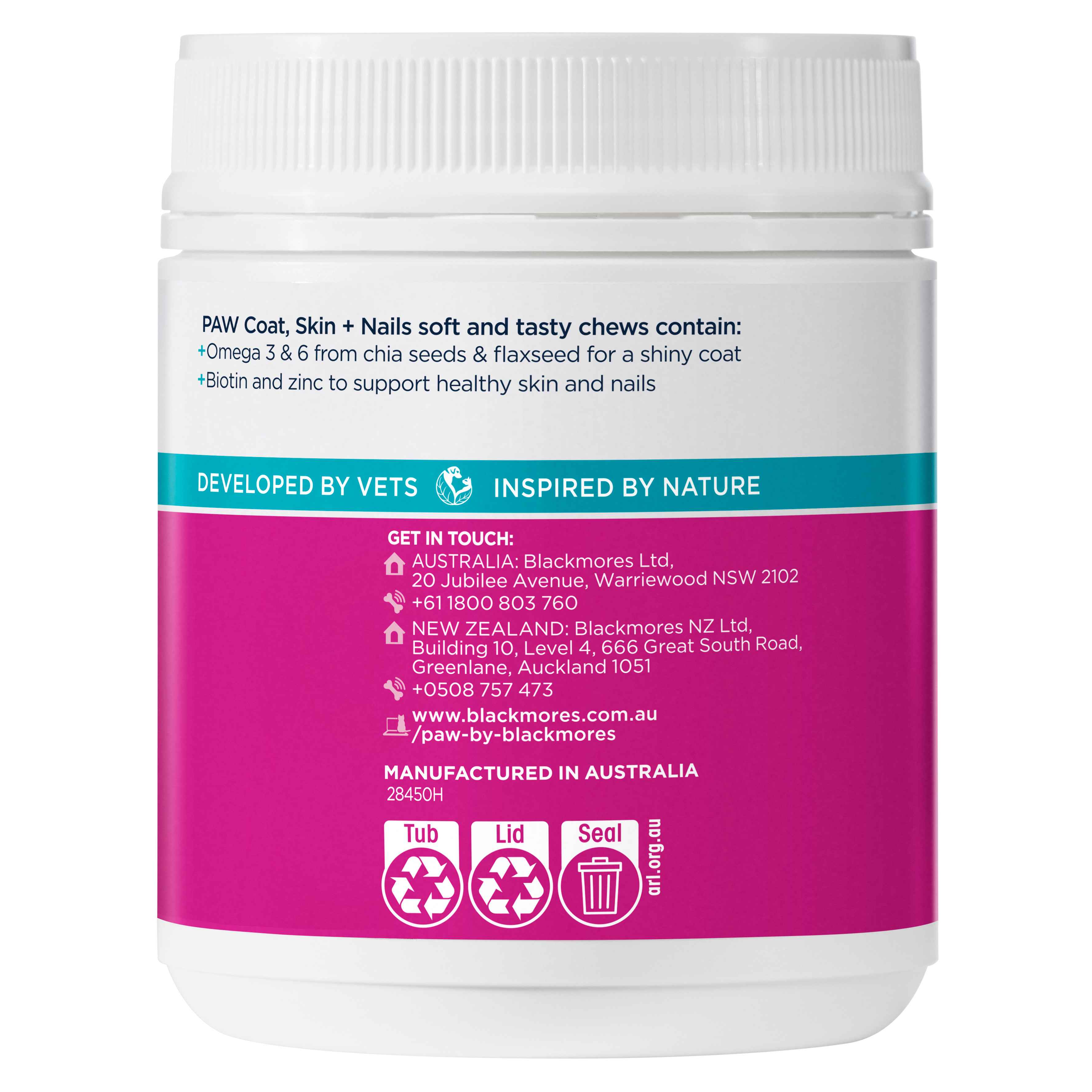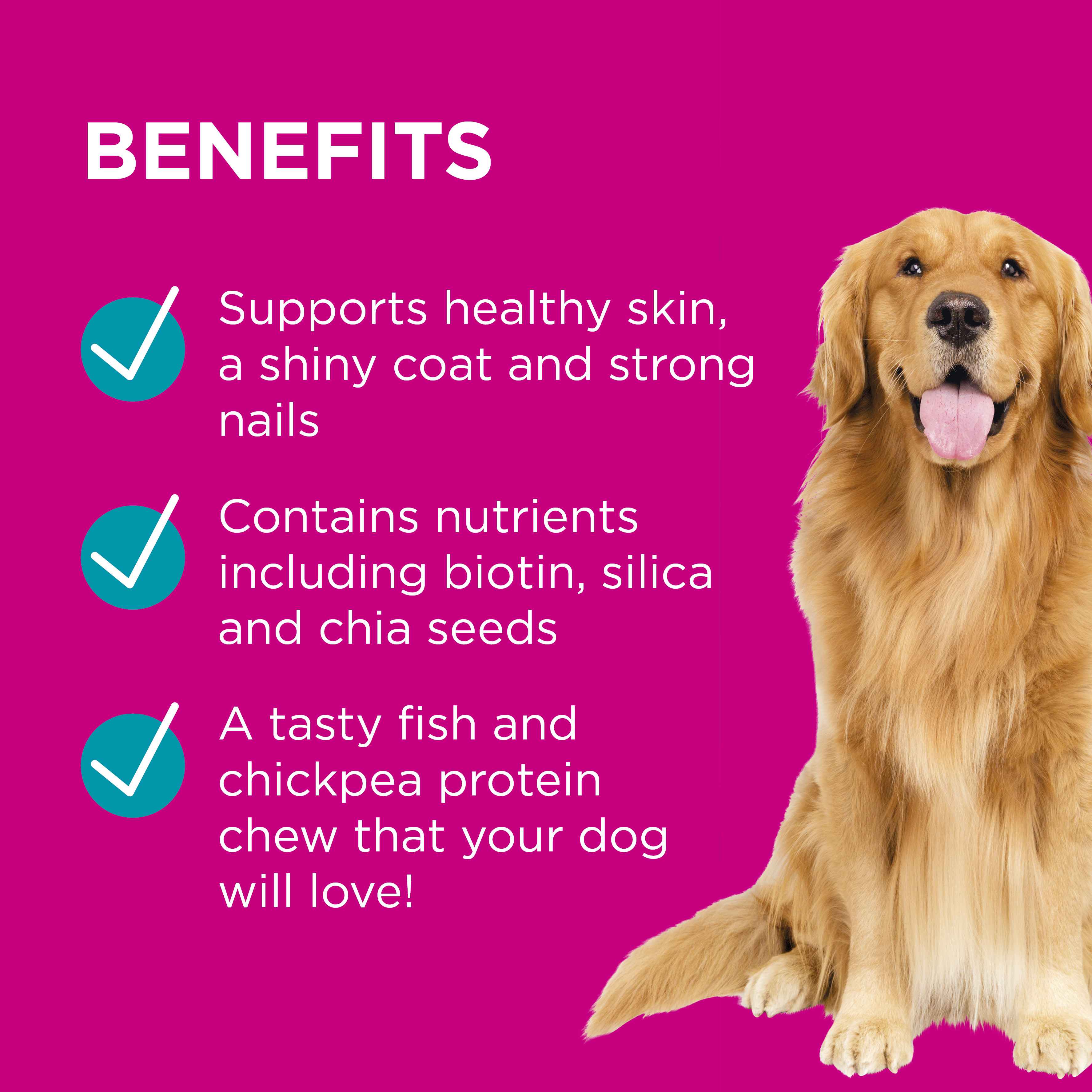 PAW Coat, Skin + Nails™ 複合維生素咀嚼片蘊含生物素和奇亞籽等必需營養素,有助於維持狗狗的皮膚和毛髮健康。