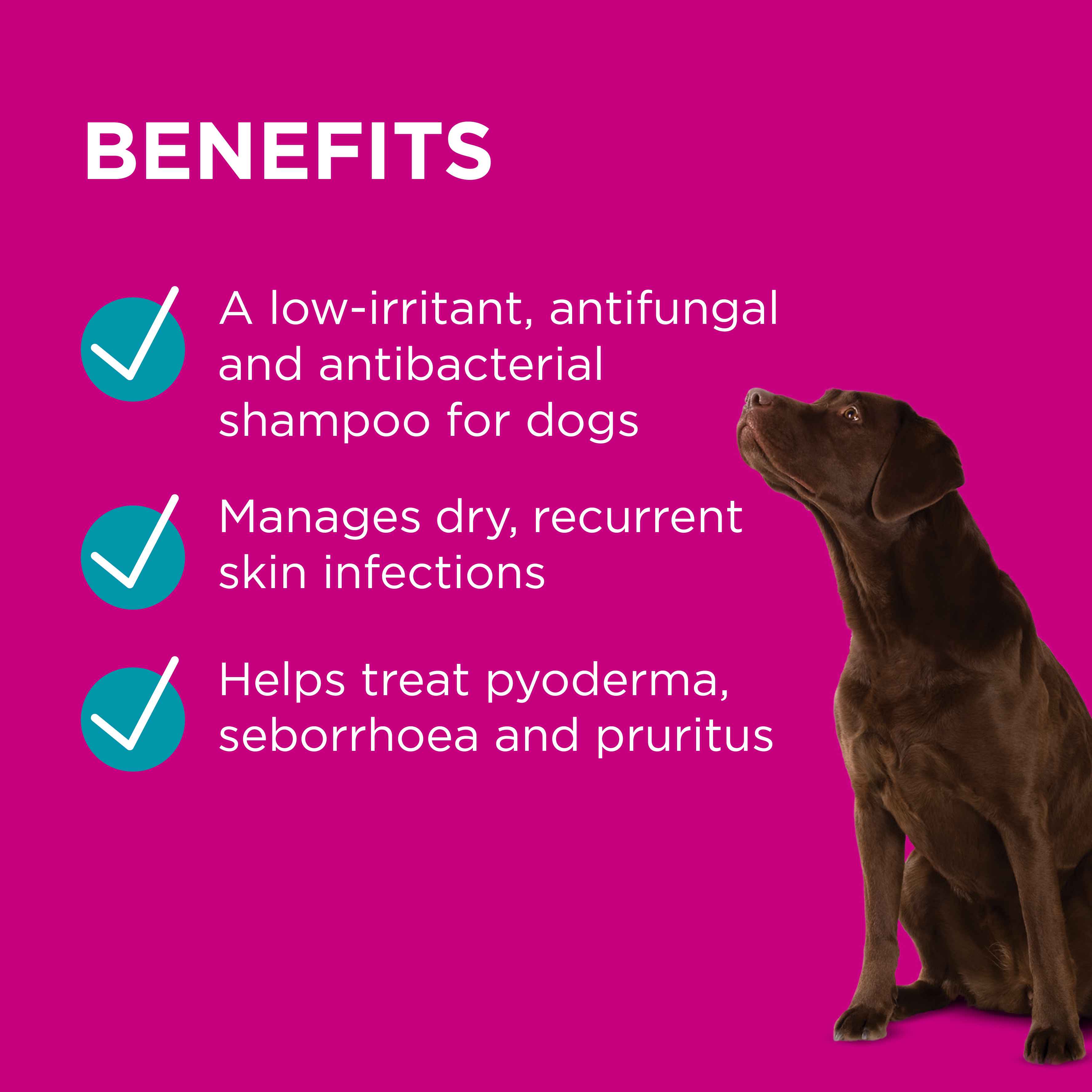本產品專為緩解乾燥、刺激和搔癢的皮膚而設計,可有效治療膿皮症、脂漏性皮膚炎和與這些疾病相關的搔癢。這款洗髮精還能幫助控制中間型葡萄球菌和厚皮馬拉色菌。
