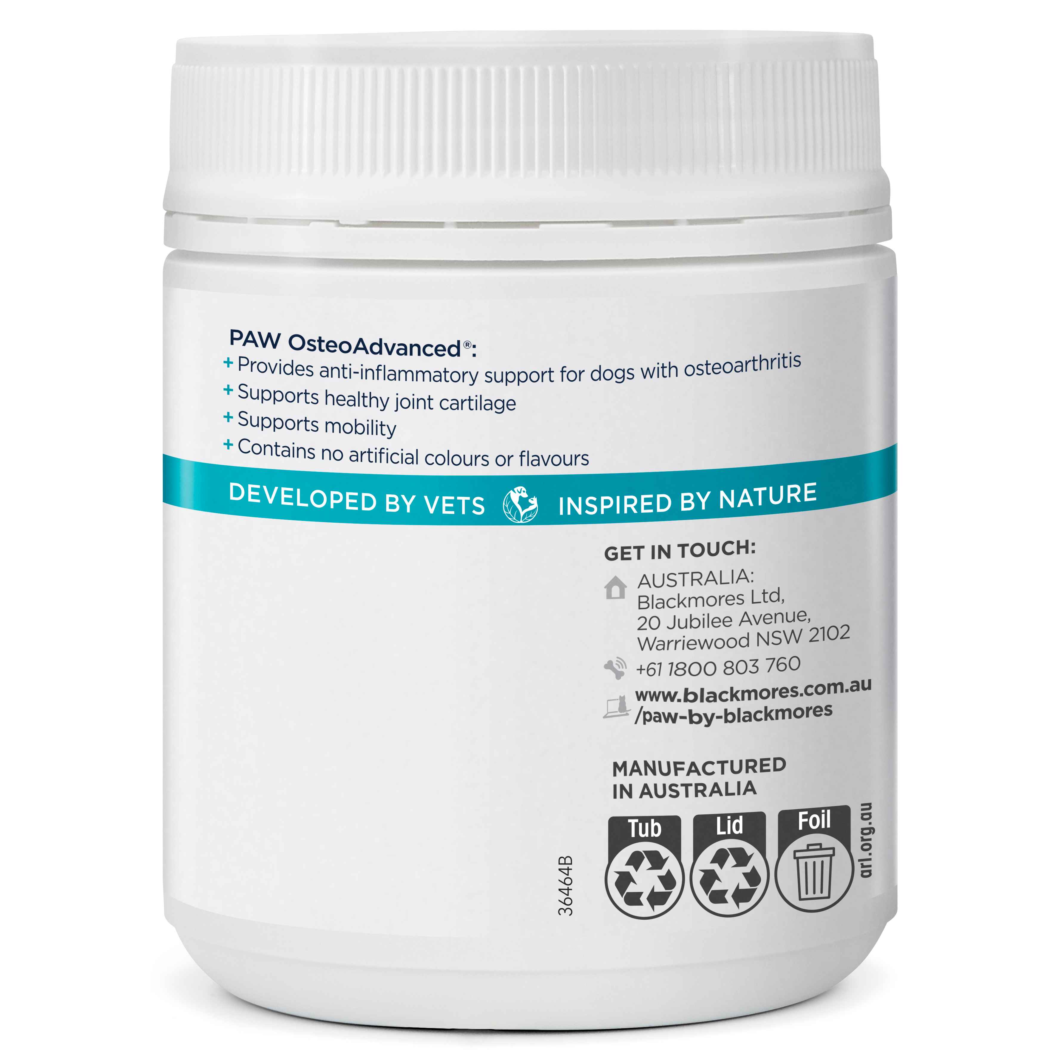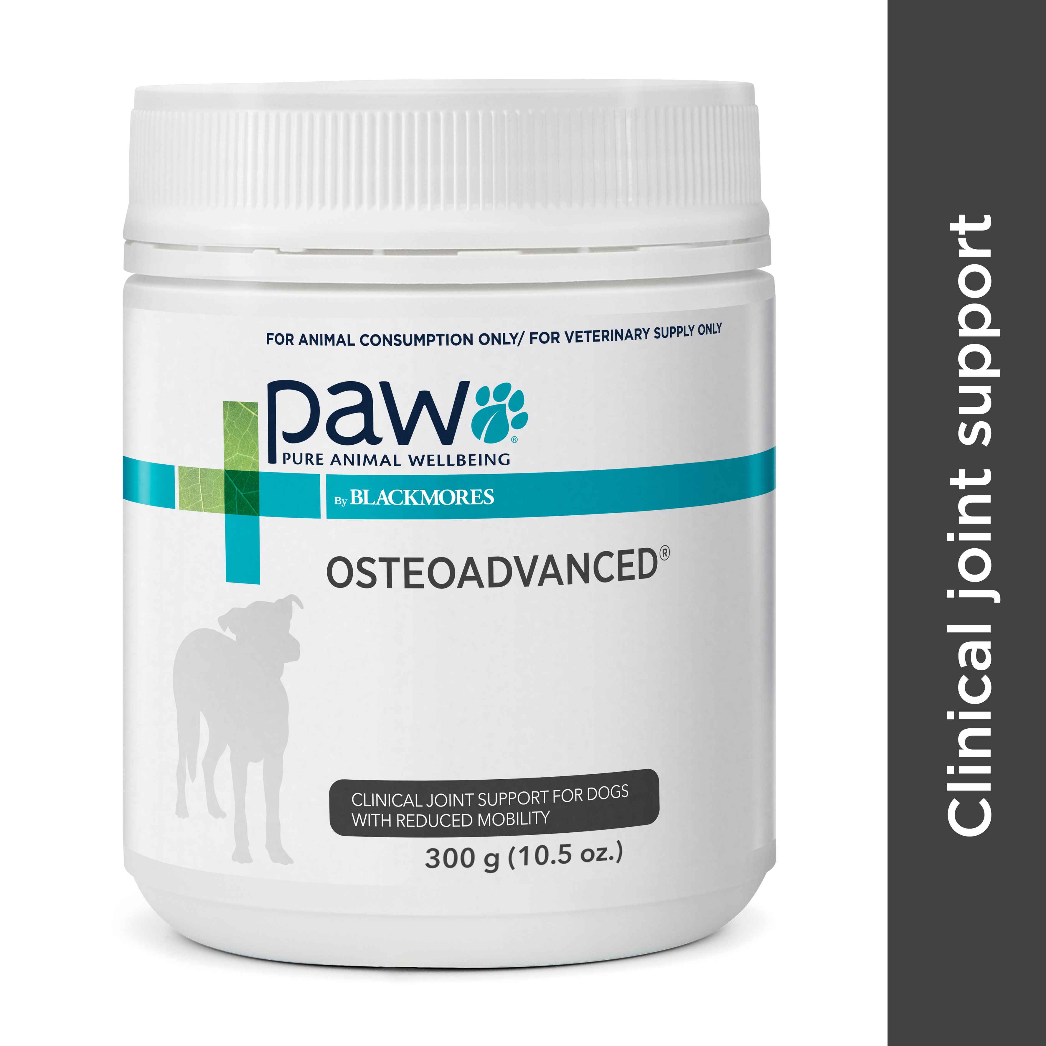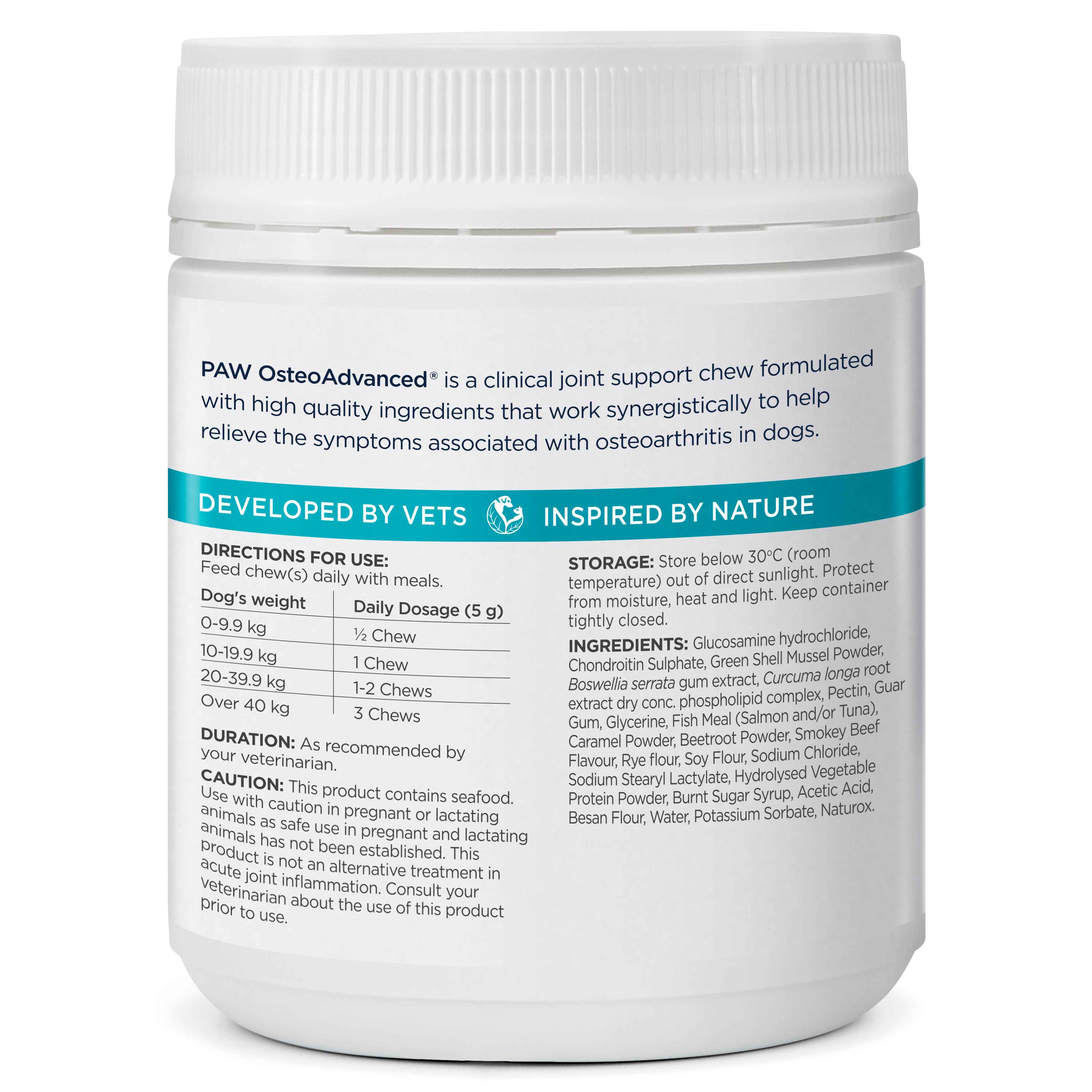 PAW OsteoAdvanced 是一種三效抗發炎咀嚼片。含有薑黃素、乳香、綠唇貽貝粉、葡萄糖胺和軟骨素的組合,有助於減少發炎和支持骨關節炎。