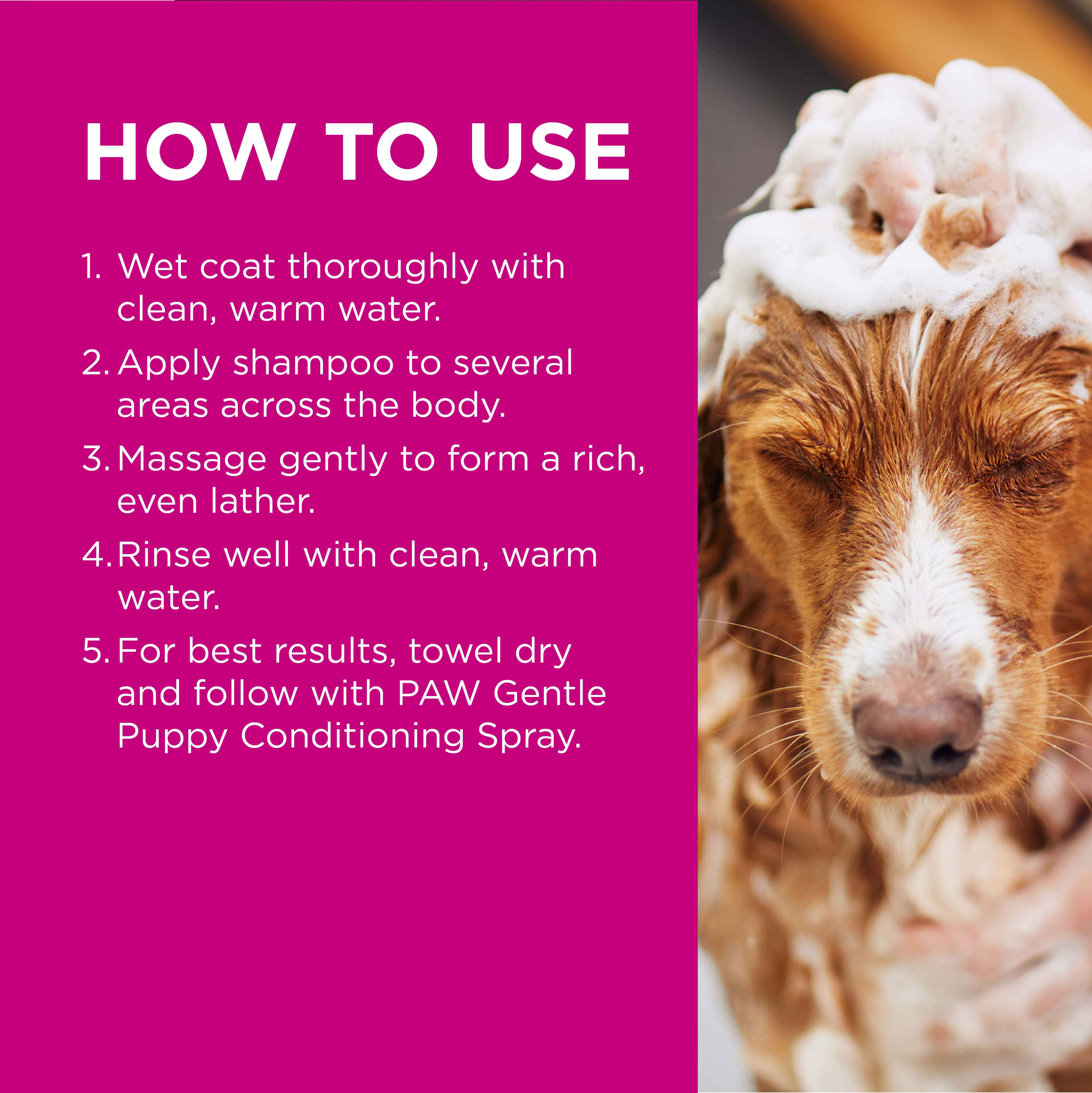 產品推薦:為獲得最佳效果,請用毛巾擦乾,然後使用PAW溫和幼犬護理噴霧。