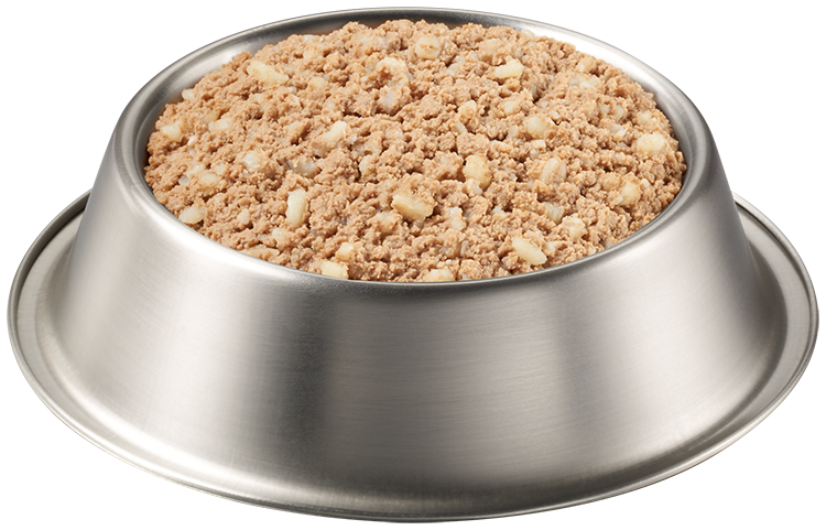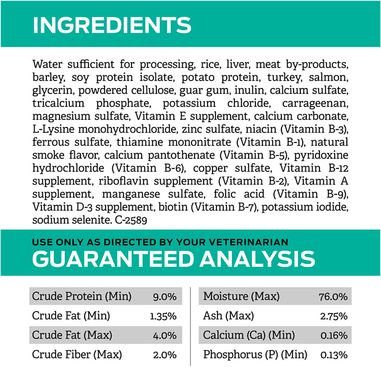 水、肉類副產品、米、麥、分離大豆蛋白、馬鈴薯蛋白、三文魚、甘油、粉狀纖維素、瓜爾豆膠、菊糖、硫酸鈣、磷酸三鈣、氯化鉀、角叉菜膠、硫酸鎂、維他命E補充劑、鹽酸L-離胺酸、硫酸鋅、菸鹼酸(維他命B-3)、硫酸亞鐵、單硝酸硫胺素(維他命B-1)、泛酸鈣(維他命B-5)、天然煙燻香料、鹽酸吡哆醇(維他命B-6)、硫酸銅、維他命B-12補充劑、核黃素補充劑(維他命B-2)、維他命A補充劑、硫酸錳、葉酸(維他命B-9)、維他命D-3補充劑、生物素(維他命B-7)、碘化鉀、亞硒酸鈉。