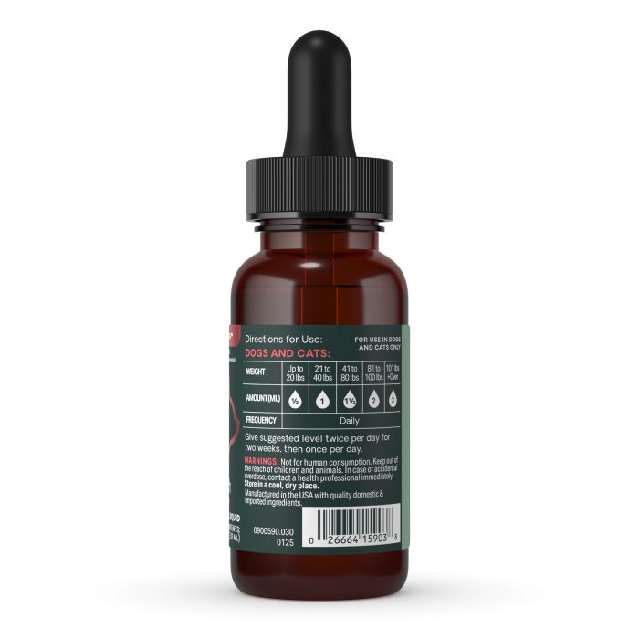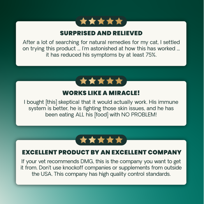 - 液態 DMG 補充劑,為狗隻及貓隻提供免疫系統健康、身體機能、大腦與神經健康等多方面的支援。