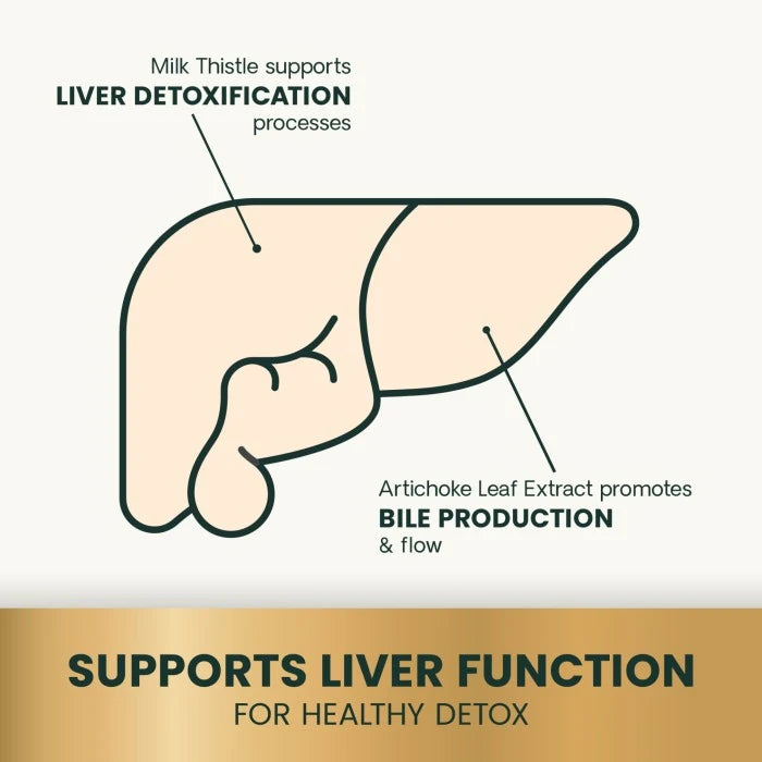 - 洋薊葉萃取物及薑黃:支援肝臟及膽囊功能,促進膽汁生成及流動,膽汁是身體自然排出廢物的主要途徑之一。