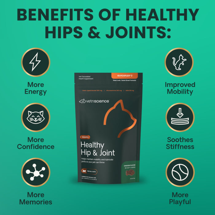 這是一款專為貓隻設計的髖關節與關節補充劑,配方包含葡萄糖胺、MSM(甲基磺酰甲烷)及青口貽貝,有助於支援關節健康、活動力及積極的生活方式。