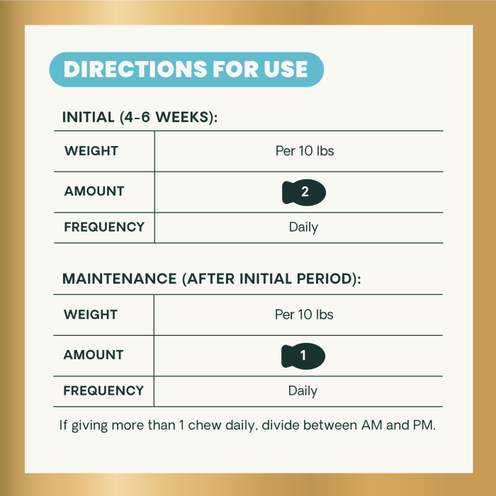 - 維持階段(初始階段後):每10磅體重每日1粒軟咀嚼片