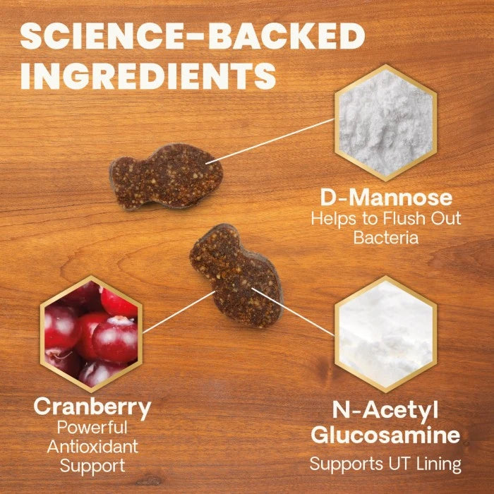 - 尿道健康補充劑,專為貓咪設計,包含蔓越莓與D-甘露糖,有助於支援膀胱及腎臟健康、平衡 pH 值並促進正常排尿。